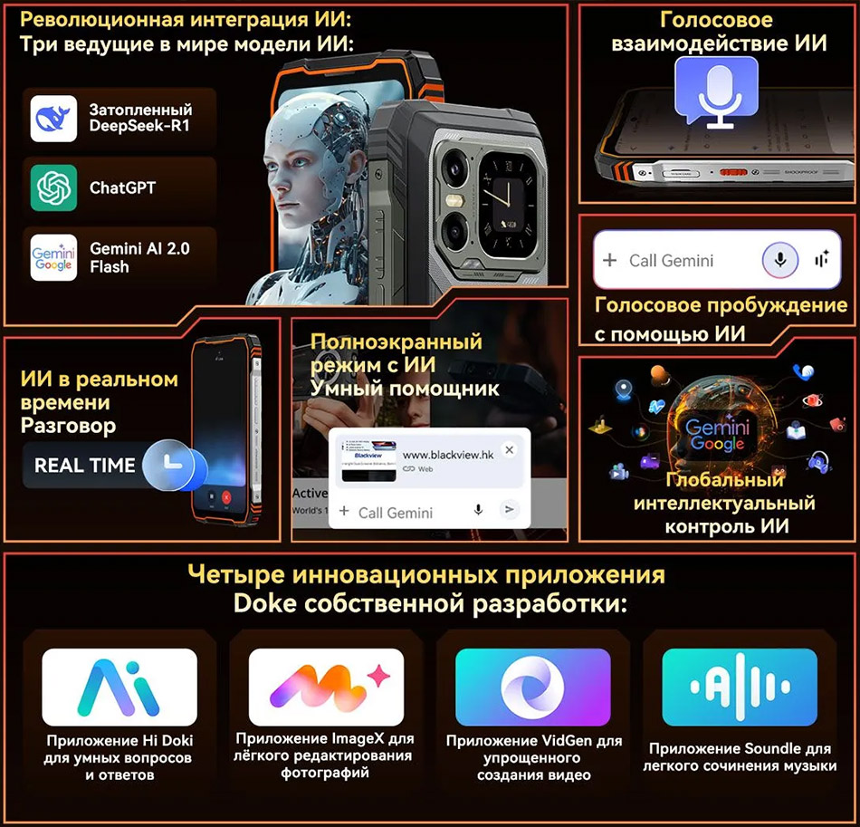 - Операционная система: Android 15 (оболочка DokeOS 4.2 от Blackview, которая обеспечивает более удобный интерфейс с чёткими иконками, более умным управлением и более плавной работой)